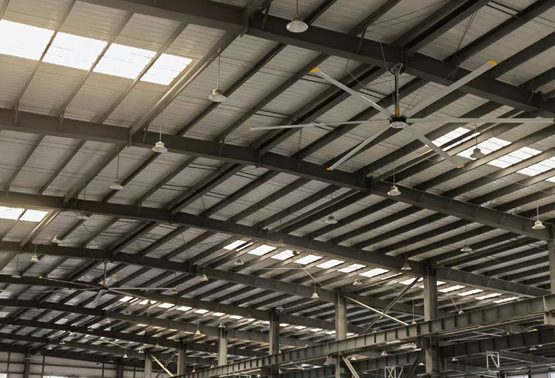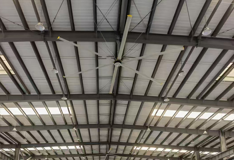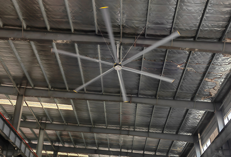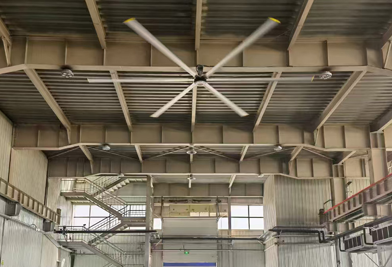 夏季阳光直射,室外平均温度超过40℃以上,常见的工业排风扇通风只能增加室内温度,而工业空调动辄几 千千瓦的能耗增加了企业运营的成本,且在不封闭的空间降温效果也不明显。大型节能吊扇的出现带来了完美的解决之道,直径达7.2米的节能吊扇,能有效的推动空气 运动产生超大风量,持续旋转的风叶形成循环气流场,有 效作用面积达到600~800平方米,是目前其他设备所不能 比拟的。